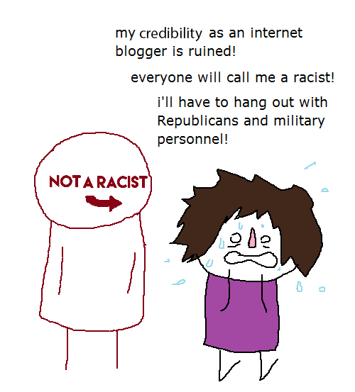 Still want to call me racist, even after reading those funny pictures? Well, guess what, sucka? I’ve never mentioned my race or my gender on this blog. If you assume I’m a white man just because I draw myself with no skin color and a square body then YOU’RE THE HETERO-NORMATIVE RACIST BIGGOT. Mwahahaha.